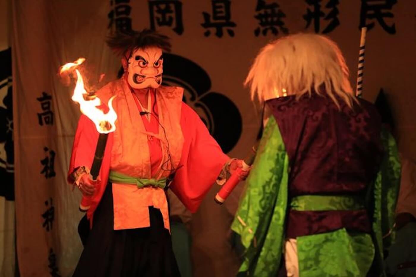 平安時代に創建されたと伝えられる高祖神社の本殿は、福岡県内で最も古い木造建築のひとつで、国の重要文化財。ここでは約550年間にわたり神楽の儀式が行われており、今でも4月と10月に奉納されている。江戸時代までは神職の奉仕で舞われていたが、明治になってからは髙祖神社の氏子たちによって受け継がれ、面を付けずに採り物を捧げて楽の音にあわせ神楽歌を唱えながら静かに舞う「舞神楽」と、面を付けた神楽師が登場して神話物語を展開させてゆく「面神楽」の2種、12演目が奉納される。秋の神楽は、松明の灯りの下で舞う夜神楽。神々を楽しませ、敬うために豪華でカラフルな衣装を伴い、五穀豊穣や子孫繁栄を祈って行われる。